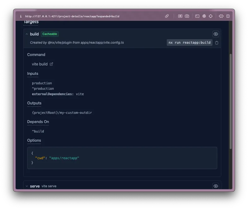 31Notice the options property defining the names of the potentially inferred targets for each plugin. These targets will be generated dynamically s.t. you can still run nx build reactapp even though there's no build target explicitly defined in the project.json of your apps/reactapp project.